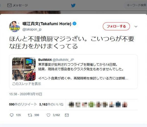 ホリエモン ほんと不謹慎厨マジうざい こいつらが不要な圧力をかけまくってる ツイートに反響 2020年3月16日 エキサイトニュース