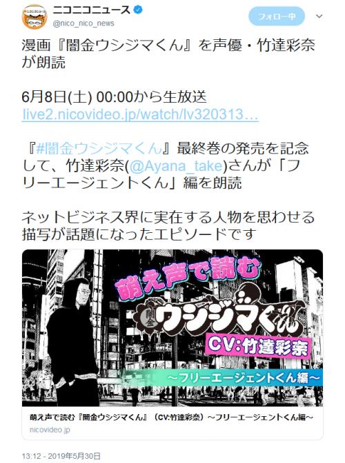 萌え声で読む闇金ウシジマくん 竹達彩奈さんが フリーエージェントくん編 を Niconico で朗読 ニコニコニュース